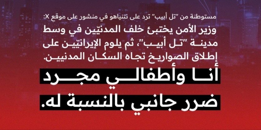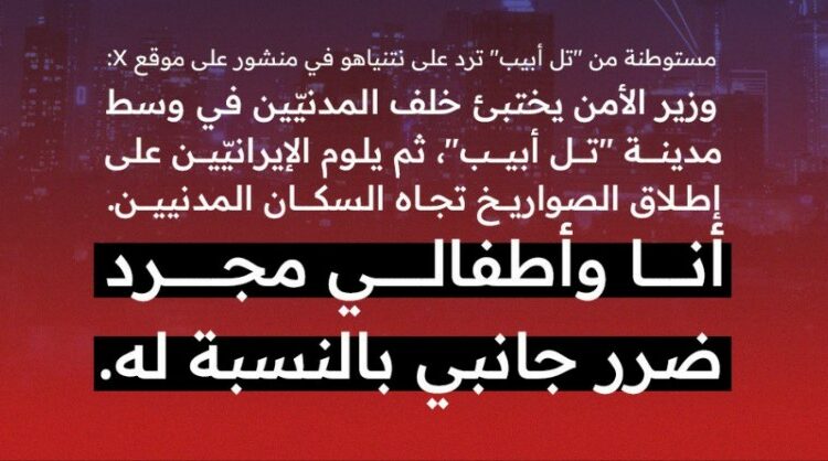 في منشور لافت على موقع X، انتقدت إحدى المستوطنات في “تل أبيب” سياسات الحكومة الإسرائيلية بعد القصف الإيراني الأخير، مشيرة إلى أن وزير الأمن الإسرائيلي “يختبئ خلف المدنيين” في وسط المدينة، مما يعرض السكان للخطر المباشر.
