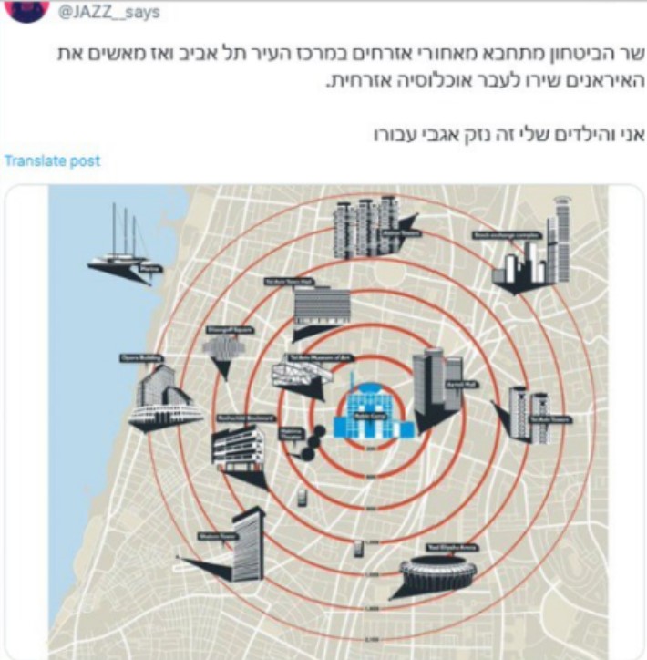 وكتبت المستوطنة في المنشور: “وزير الأمن يختبئ خلف المدنيّين في وسط مدينة “تل أبيب”، ثم يلوم الإيرانيّين على إطلاق الصواريخ تجاه السكان المدنيين.