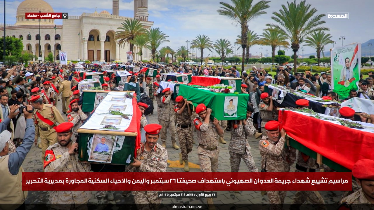 شيّعت العاصمة صنعاء، اليوم الثلاثاء، جثامين الصحفيين من كوادر صحيفتي 26 سبتمبر واليمن الذين ارتقوا في العدوان الإسرائيلي الغادر، في أكبر جريمة تستهدف الصحافة والإعلاميين في اليمن.