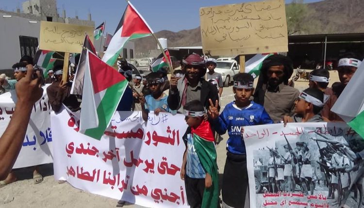 وتجمع عشرات المواطنين في منطقة الهجر بمديرية مرخة السفلى بمحافظة شبوة، للتنديد باستمرار وجود قوات التحالف في الأراضي اليمنية، مطالبين برحيلها الكامل دون قيد أو شرط.