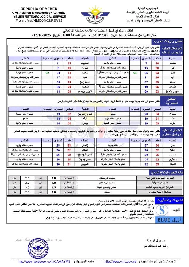 وتوقع المركز أن يسود طقس بارد نسبيًا إلى بارد خلال ساعات الليل المتأخرة والصباح الباكر على مرتفعات محافظات لحج، الضالع، البيضاء، شمال إب، ذمار، صنعاء، عمران وصعدة، مع درجات حرارة تتراوح بين 3 و8 درجات مئوية.
