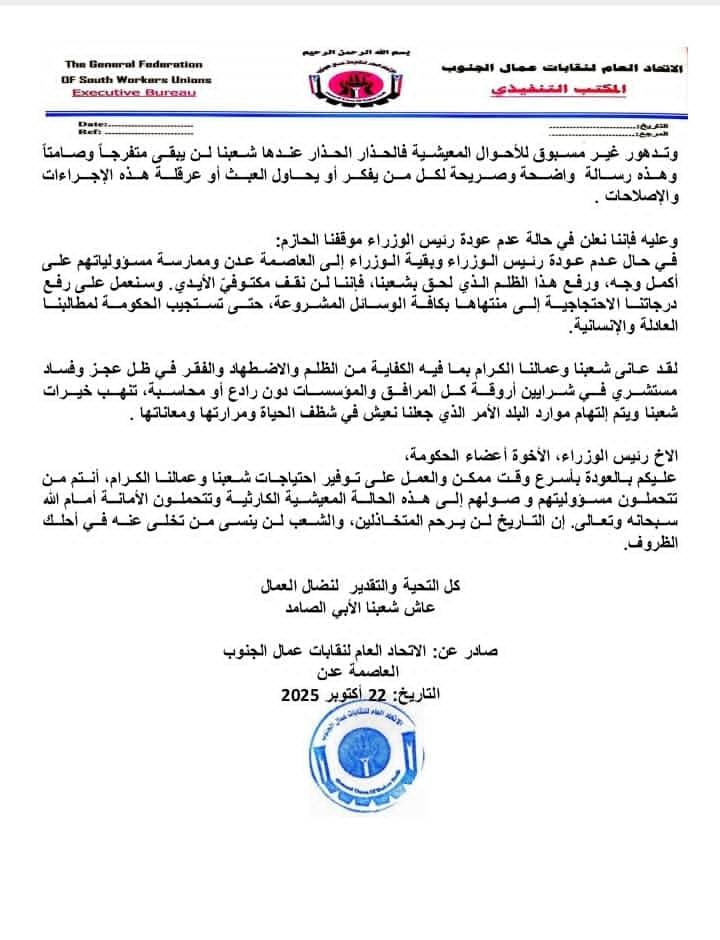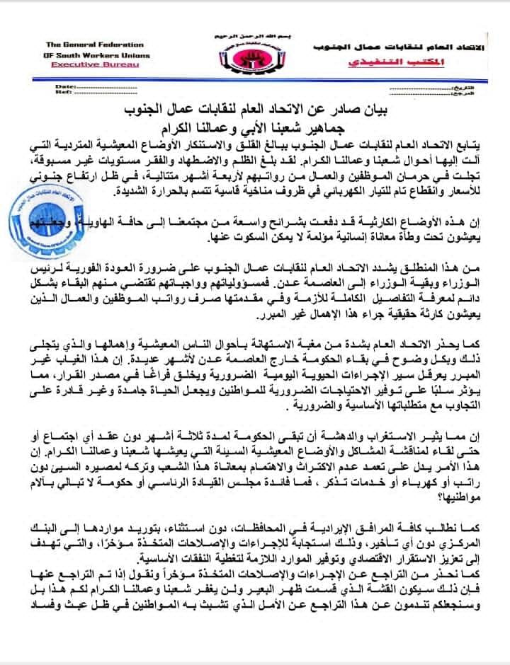 كما طالب الاتحاد كافة المرافق الإيرادية دون استثناء، بسرعة توريد مواردها إلى بنك عدن المركزب، التزاماً بماسماها” الإجراءات والإصلاحات الاقتصادية”، محملاً الجهات المعنية مسؤولية استمرار تدهور الأوضاع المعيشية والمعاناة التي يواجهها العمال والموظفون.