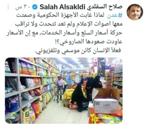 وفي هذا السياق، تساءل الصحفي صلاح السقلدي في منشور له على منصة إكس عن أسباب صمت الجهات الرسمية والإعلامية حيال ما يجري، قائلاً: “عدن.. لماذا غابت الأجهزة الحكومية وصمتت معها أصوات الإعلام ولم تعد تتحدث ولا تراقب حركة أسعار السلع وأسعار الخدمات، مع أن الأسعار عاودت صعودها الصاروخي؟! فعلاً الإنسان كائن موسمي وتلفزيوني”.