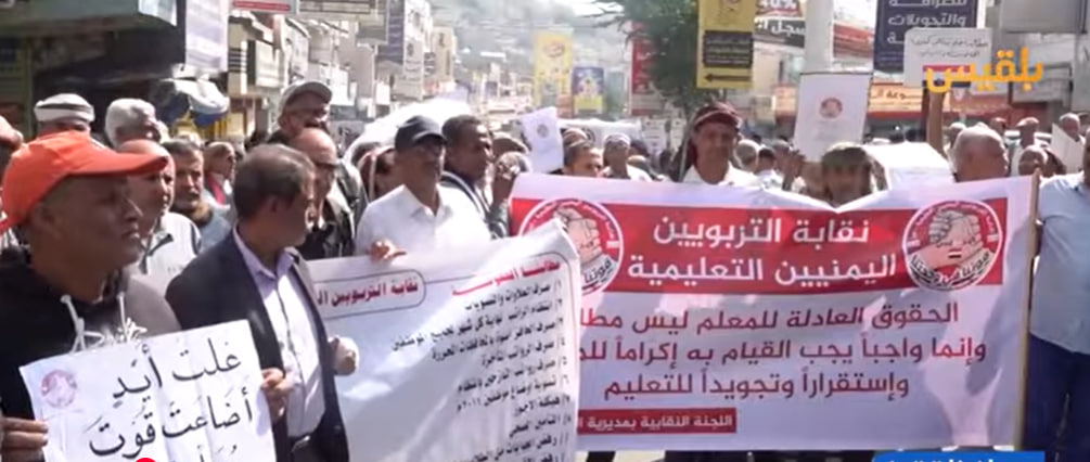 ورفع المشاركون في المظاهرة لافتات تطالب الحكومة بسرعة صرف المرتبات وتحسين أوضاعهم، محذرين من استمرار تجاهل معاناة الكادر التربوي.