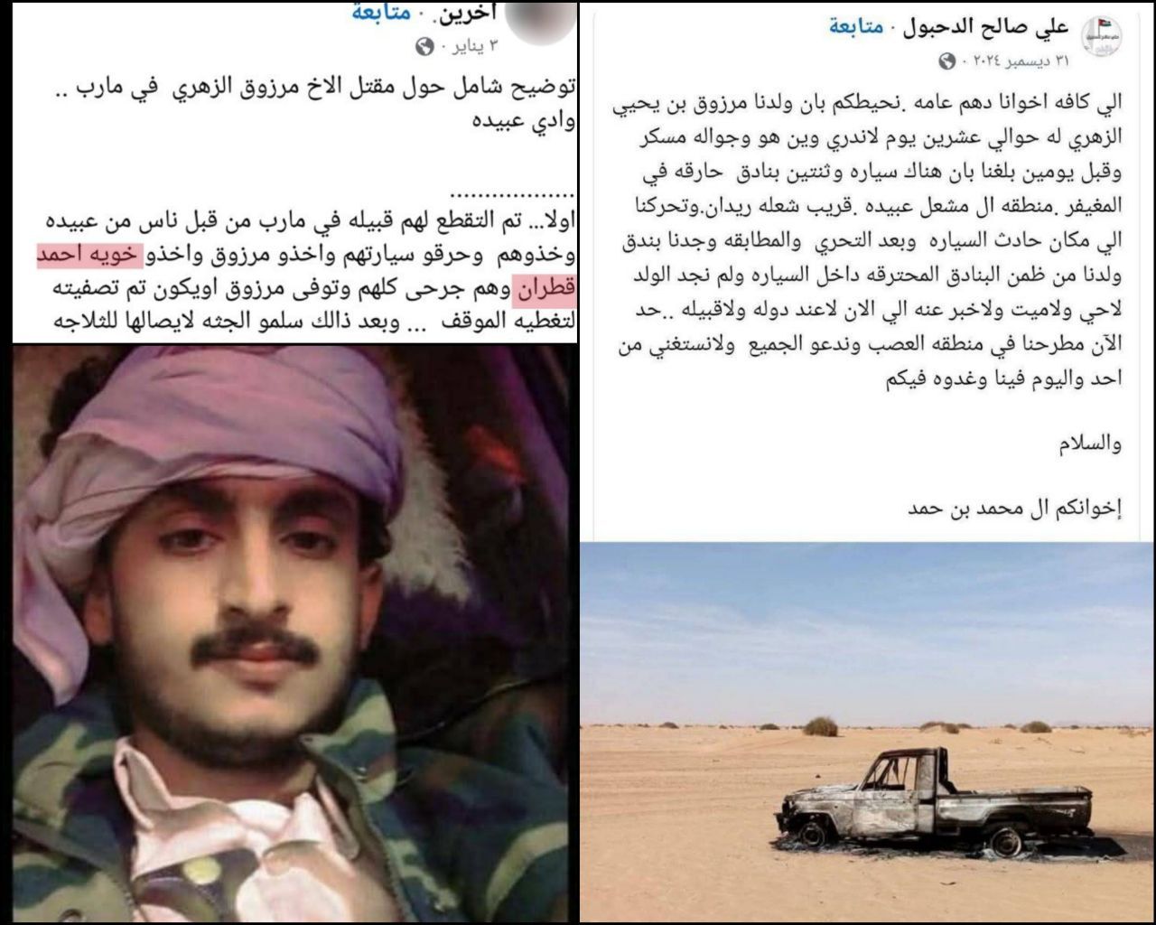 وروى أن قطران كان قد تعرض في ديسمبر 2024 لحادث مأساوي عندما كان برفقة المواطن “مرزوق يحيى علي الزهري” من قبيلة “من آل محمد بن حمد ذوحسين” في منطقة اليتمة بمحافظة الجوف، حيث تعرضا “للتقطع” في منطقة الصمدة بصحراء مأرب.