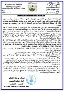 لجنة اعتصام المهرة تحمّل “الجهات الخارجية” وأدواتها المحلية من إشعال الصراع في حضرموت