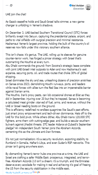 وفي ختام منشوره، قدّم أفيدان رؤية مستقبلية لما يراه مساراً مشتركاً بين الإمارات وإسرائيل، قائلاً: “تفكيك بؤر الإرهاب في اليمن محافظة بعد أخرى، لتؤسس الإمارات وإسرائيل شرقاً أوسطاً أكثر أمناً وازدهاراً وتكاملاً وخالياً من الإرهاب”. وأضاف أن ما سماه “اتفاقات إبراهيم الثانية ليست حلماً بل انتصاراً”، مؤكداً أن الإمارات “تستحق الثناء لدورها في تحرير الولايات المتحدة من عبء الاستقرار الأمني في المنطقة”.