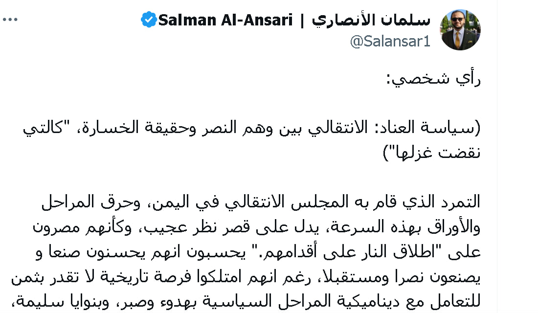 قال كاتب وباحث سعودي مشهور إن المجلس الانتقالي في اليمن يعيش حالة من التمرد السياسي والعسكري، ووصف تمرد الانتقالي بأنه “إطلاق النار على الأقدام”، حيث اختاروا نقض غزلهم بأيديهم.