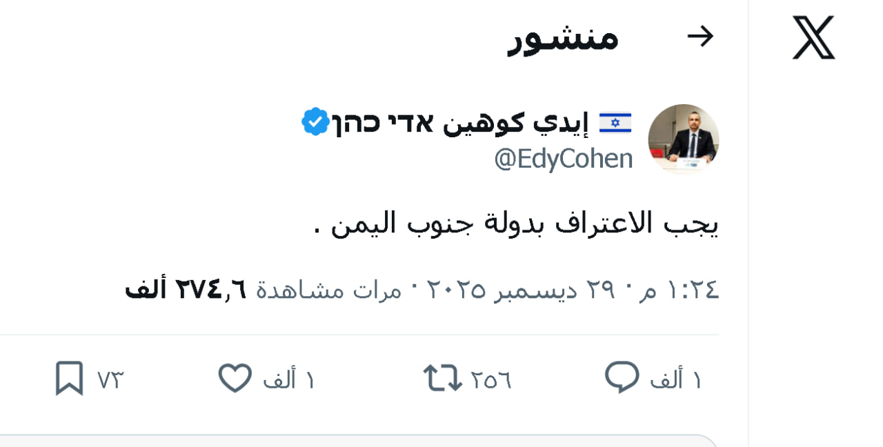 وجاءت دعوة كوهين في منشور له على منصة إكس، حيث كتب ضرورة الاعتراف بجنوب اليمن كدولة مستقلة، في سياق يعكس توجها إسرائيليا لدعم كيانات انفصالية في المنطقة.