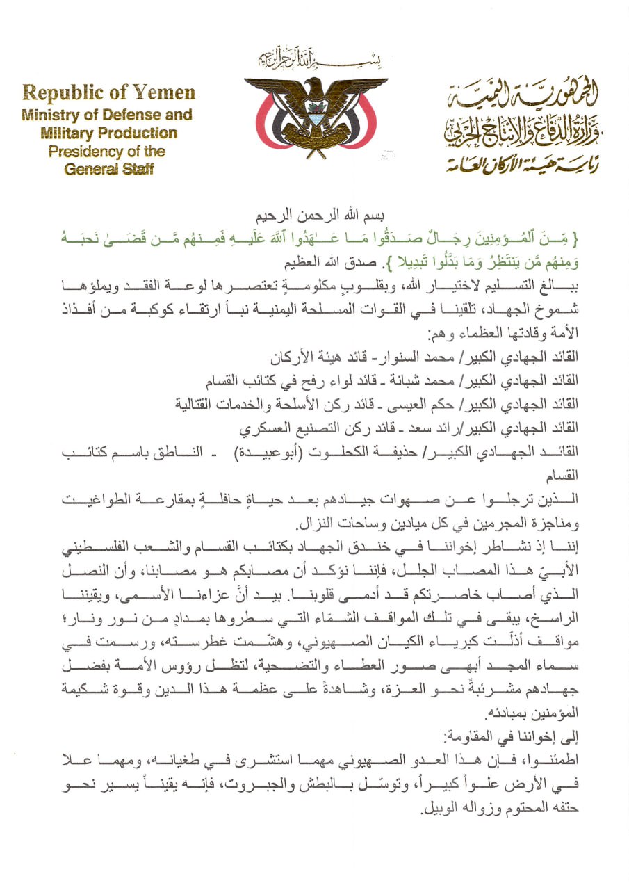 بعث رئيس هيئة الأركان العامة للقوات المسلحة اليمنية، اللواء الركن يوسف حسن المداني، برقية عزاء ومواساة إلى حركة حماس والشعب الفلسطيني في استشهاد ثلة من قيادات كتائب القسام.