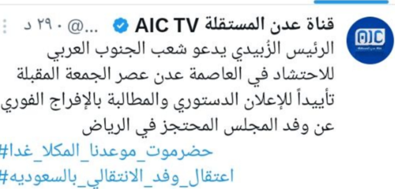 دعا عيدروس الزبيدي الموالين للانتقالي الجنوبي إلى الاحتشاد في عدن عصر يوم الجمعة المقبلة، تأييدا للإعلان الدستوري، والمطالبة بالإفراج الفوري عن وفد المجلس المحتجز في الرياض، في خطوة تعد أول ظهور وتحرك علني له منذ مغادرته البلاد.