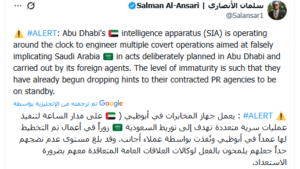 وقال الصحفي سلمان الأنصاري، في منشور على حسابه بمنصة “إكس”، إن “جهاز المخابرات في أبوظبي يعمل على مدار الساعة لتنفيذ عمليات سرية متعددة، بهدف توريط السعودية زوراً في أنشطة تم التخطيط لها مسبقاً داخل أبوظبي، وتنفذ عبر عملاء أجانب”.