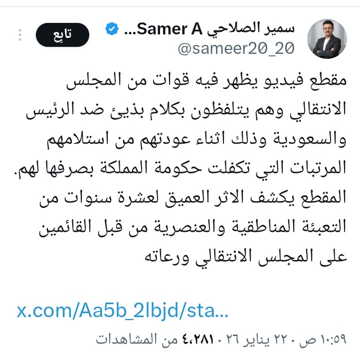 ولم تقتصر الهتافات على الإساءة للسعودية فحسب، بل امتدت لتشمل عبارات مسيئة بحق محمد بن سلمان، ورشاد العليمي، الأمر الذي اعتبره مراقبون مؤشرًا خطيرًا على اتساع دائرة السخط والتمرد داخل صفوف القوات التابعة للمجلس الانتقالي.