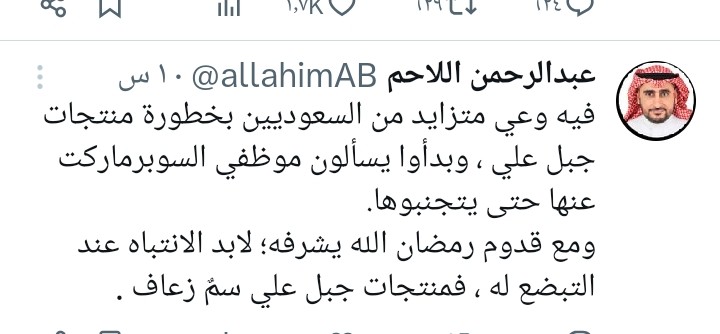 وفي هذا السياق، قال الكاتب والناشط السعودي عبد الرحمن اللاحم إن هناك “وعيًا متزايدًا بين السعوديين بخطورة منتجات جبل علي”، مشيرًا إلى أن كثيرين باتوا يسألون موظفي المتاجر الكبرى عن مصدر السلع المعروضة لتجنب شرائها. وأضاف في منشور على منصة إكس:“ومع قدوم رمضان، لا بد من الانتباه عند التبضع له، فمنتجات جبل علي سم زعاف”، في تعبير يعكس حدة الخطاب الذي رافق الحملة.