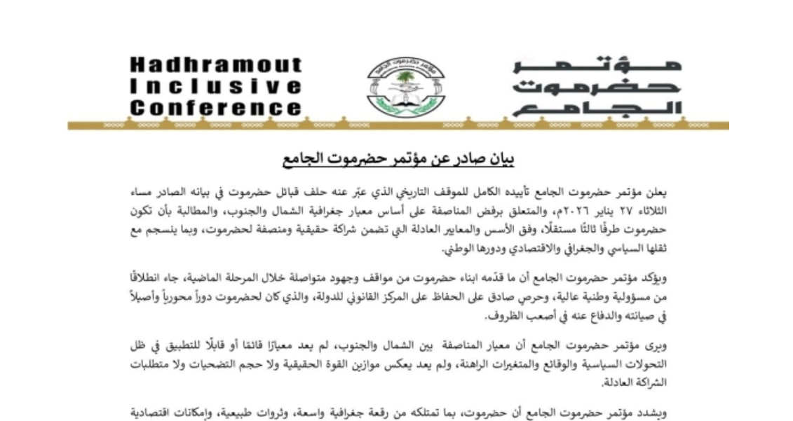 كما طالب المؤتمر بترتيبات عادلة تضمن شراكة حقيقية ومنصفة، بما يحقق تطلعات أبناء حضرموت ويعزز مكانتها كشريك مستقل في أي عملية سياسية مستقبلية.