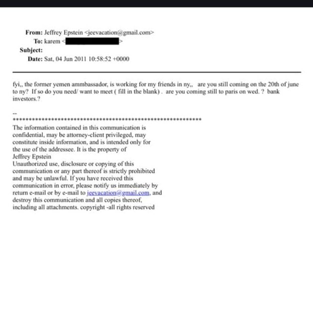 تداول ناشطون على مواقع التواصل وثيقة بريد إلكتروني تظهر أنها أُرسِلت من رجل الأعمال الأمريكي جيفري إبستين في 4 يونيو 2011، تتضمن إشارة غير مباشرة إلى سفير يمني سابق، ما أثار ضجة جديدة في سلسلة الوثائق المرتبطة بملف إبستين.