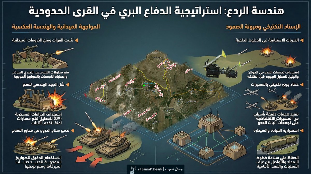 تتميز الاستراتيجية الدفاعية للمقاومة في القرى الأمامية (مثل الخيام، الطيبة، والعديسة) بالتصدي البري الشرس والهندسة القتالية المتوازية.