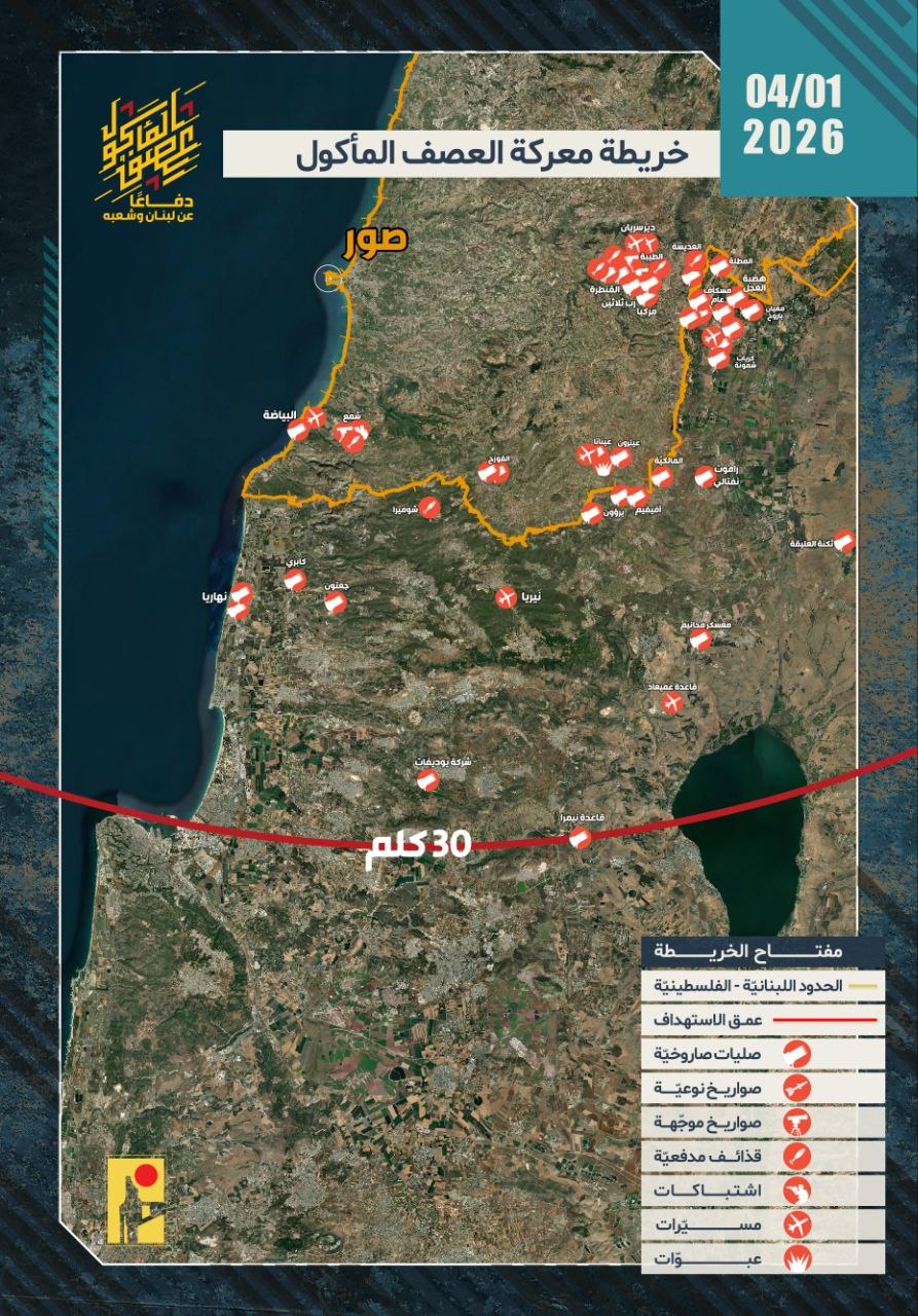 أعلنت المقاومة الإسلامية في لبنان (حزب الله)، في بيان، الأربعاء 1 نيسان/أبريل 2026، تنفيذ 60 عملية عسكرية استهدفت مواقع وانتشار جيش الاحتلال الإسرائيلي عند الحدود اللبنانية الفلسطينية، إضافة إلى قواعد ومستوطنات في شمال فلسطين المحتلة، وذلك في إطار ما وصفته بالرد على الاعتداءات الإسرائيلية.