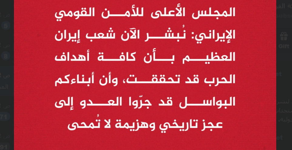 المجلس الأعلى للأمن القومي الإيراني يعلن انتصار إيران ورضوخ أمريكا و”إسرائيل” لكل شروطها