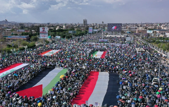 ورفعت الجماهير أعلام اليمن وفلسطين ولبنان وإيران والعراق، مباركة انتصار محور المقاومة، مع التشديد على أن هذا التطور يعزز معادلة الردع ويكرس وحدة المواجهة.